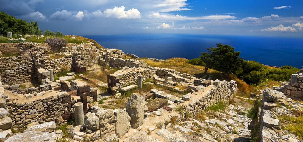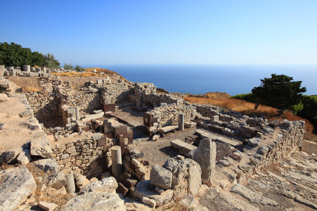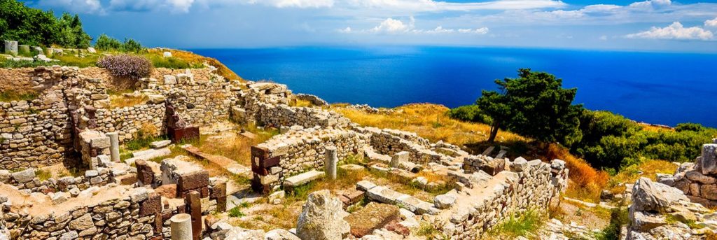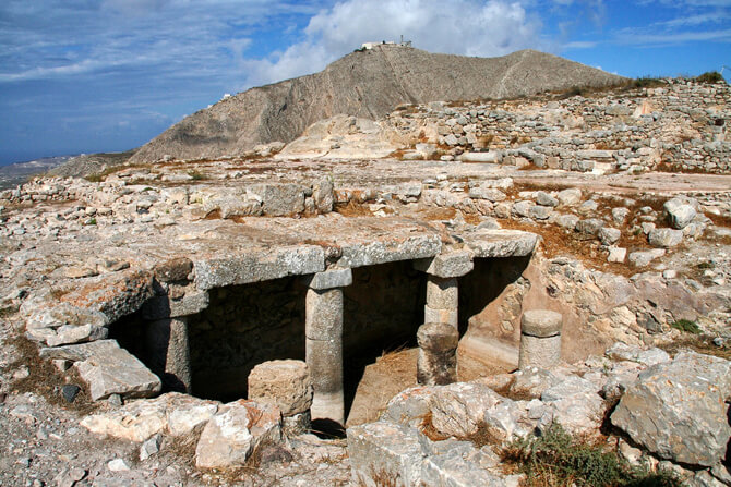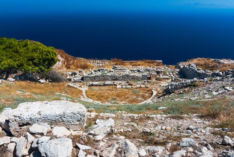 Ancient Thera (Greek: Αρχαία Θήρα) is an ancient city on a ridge of the steep, 360 m high Messavouno mountain on the Greek island of Santorini. It was named after the mythical ruler of the island, Theras, and was inhabited from the 9th century BC until 726 AD. Starting in 1895, Friedrich Hiller von Gaertringen systematically investigated the city until 1904. Later excavations by N. Zapheiropoulos between 1961 and 1982, under the auspices of the Archaeological Society of Athens, unearthed the city’s necropolis in Sellada. Findings from these excavations are on exhibit at the archaeological museum in Fira. Excavation work was again taken up between 1990 and 1994 under the leadership of Wolfram Hoepfner of the Free University of Berlin and resulted in a more precise understanding of the history of the southern Aegean.